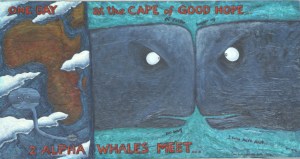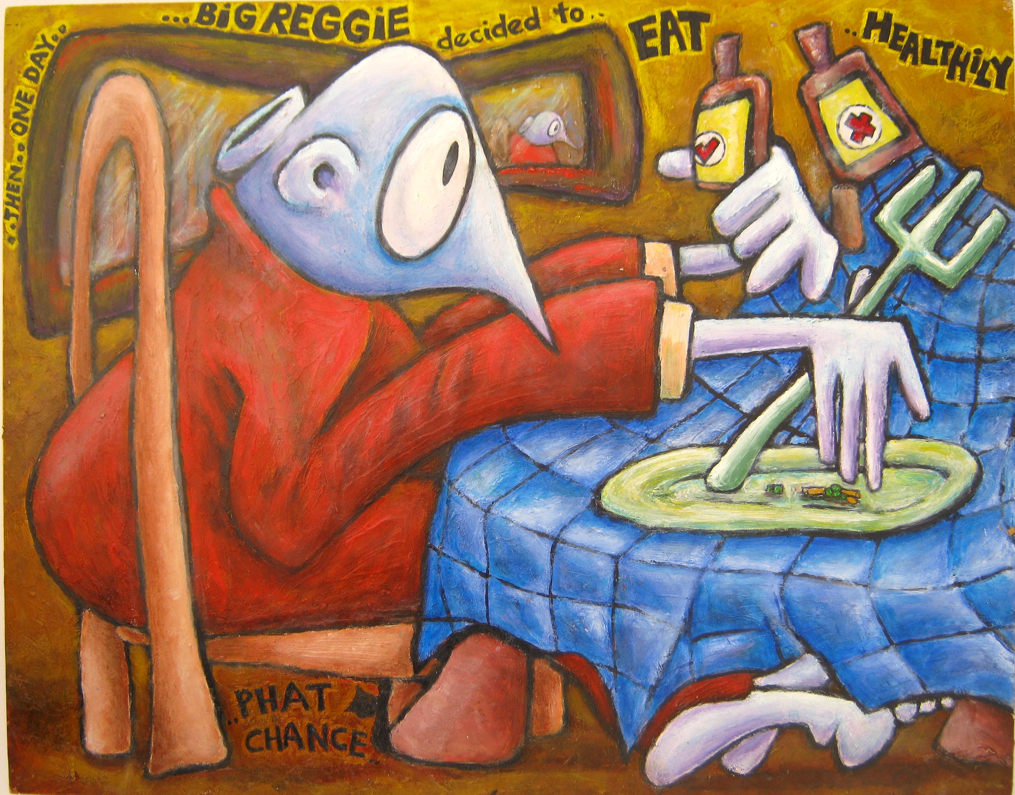 4 cartoon paintings (click through). Haven’t a clue where Stanley and Reggie came from. The New Boyfriend is a true story, that’s what he looked like . Alpha Whales was a comment on lawyers, male and female – as I recall it, the pun emerged after the idea but it fits.