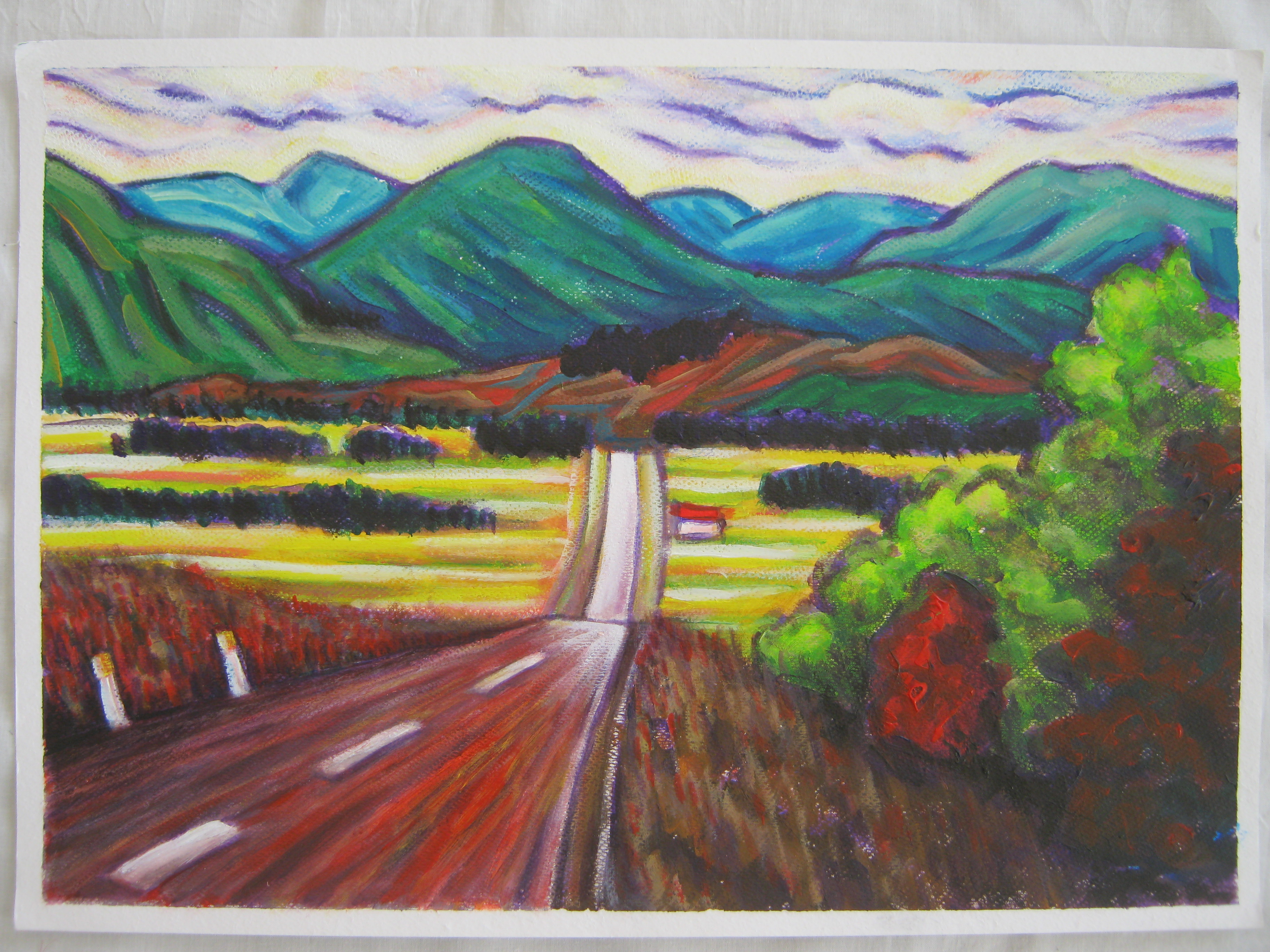 I started this in 2003. Its acrylic about 36’x36″. It was based on a view of the Southern Alps in my rear vision mirror when driving from Queenstown to Christchurch. Much later, I’ve seen exactly this image in Air New Zealand’s inflight magazine.