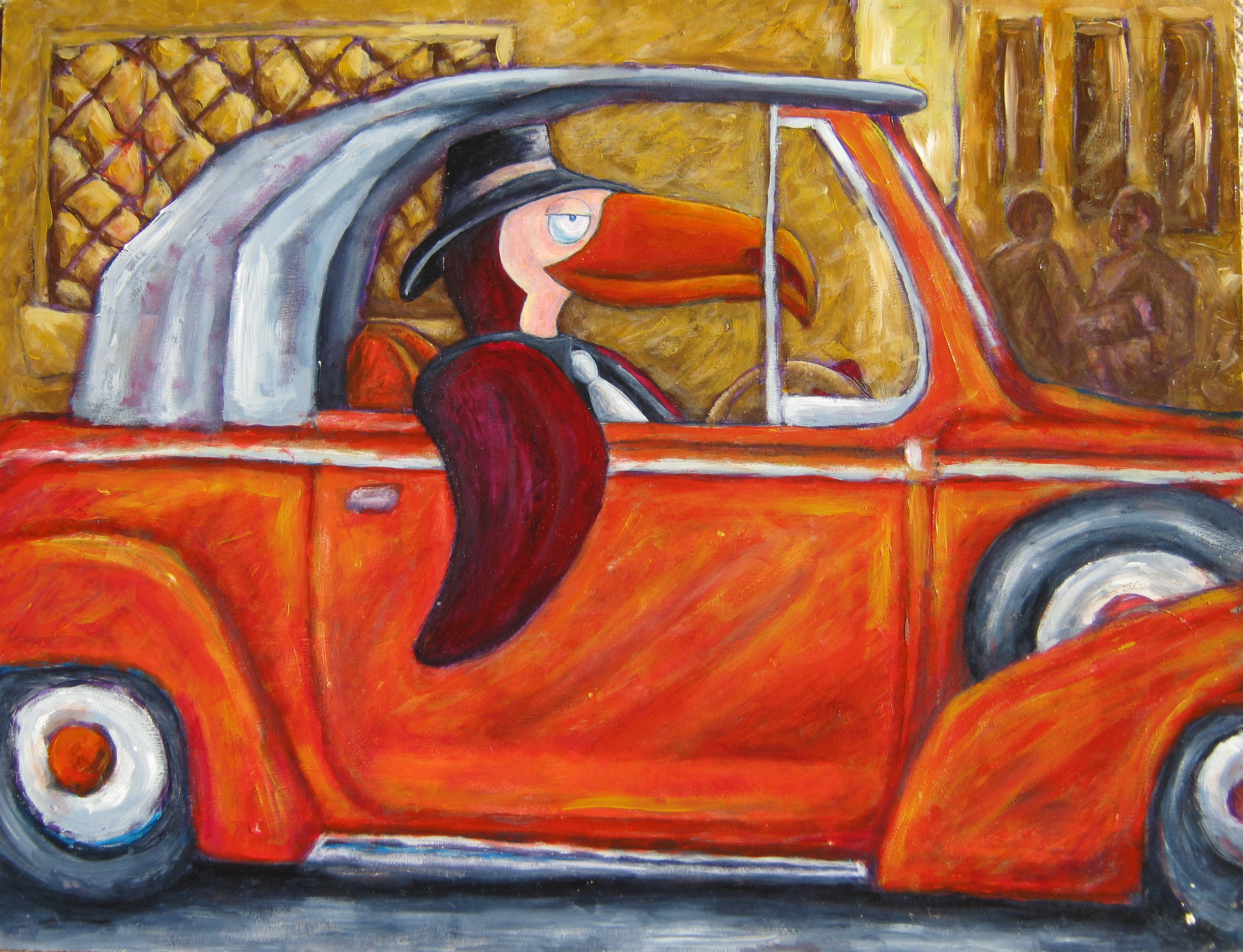 Dont mess with the toucan! He’s just got to be Cuban given the car, even if its shortened from the gangster standard. Acrylic on board, 18″x18″