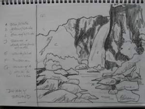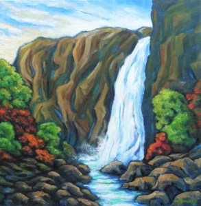 Would like to say I sketched these images in situ back then – but that didn’t happen. Both are oils, the main one is a Colin McCahon-inspired piece which I like for its simplicity, but no-one else seems to. The second image is more popular – people like the movement in the waterfall and the colours in the cliffs and rocks (not sure the photo captures that very well?). The weak point for me is the trees – I’ll deal to them when I’m in the zone on something else.