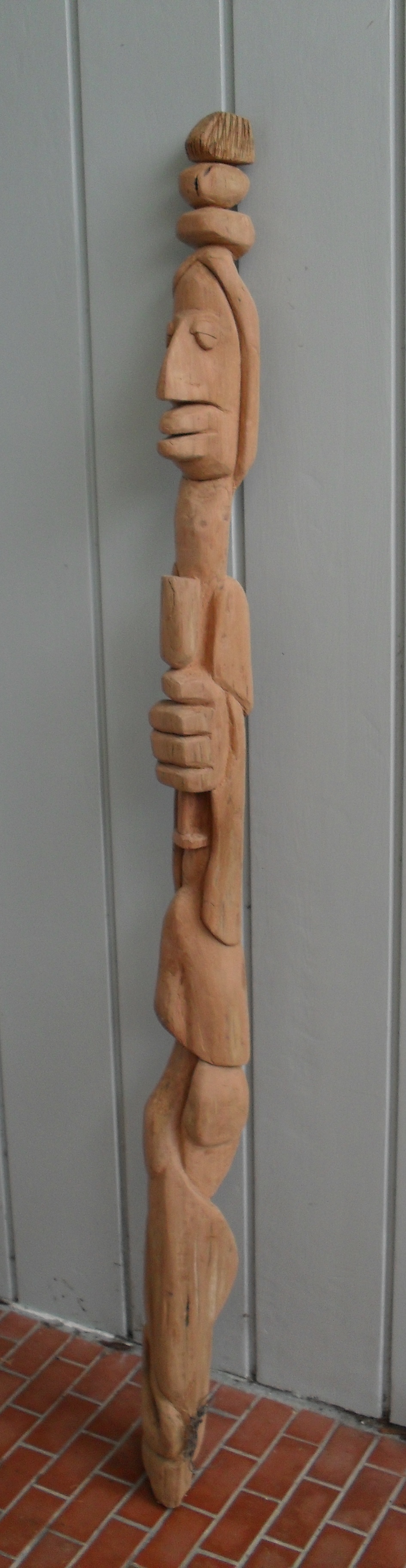 The second of 4 recent sculptures from old wooden fence posts. She started from rough sketches (attached plus a previous stonework) but mostly was worked in progress – the wine glass came from cutting too deeply too soon and the crossed legs (too many wines?) and topknots were suggested by the grain.