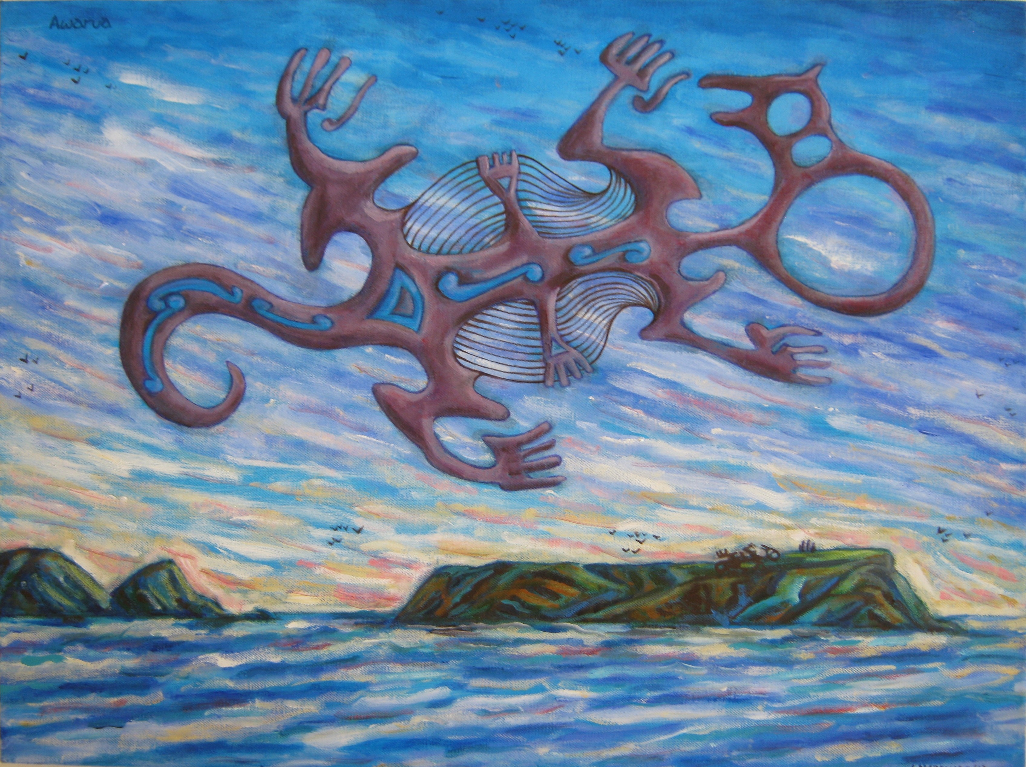 Awarua is a taniwha (see below) of Porirua harbour. The young Awarua wanted to be able to migrate with his friends the birds. So he taught himself to fly, secretly by night with the help of Rereroa the albatross. He crashed twice on his first public flight – the 1st time carving out a gully at Onepoto, and the 2nd time taking the top off Mana Island.