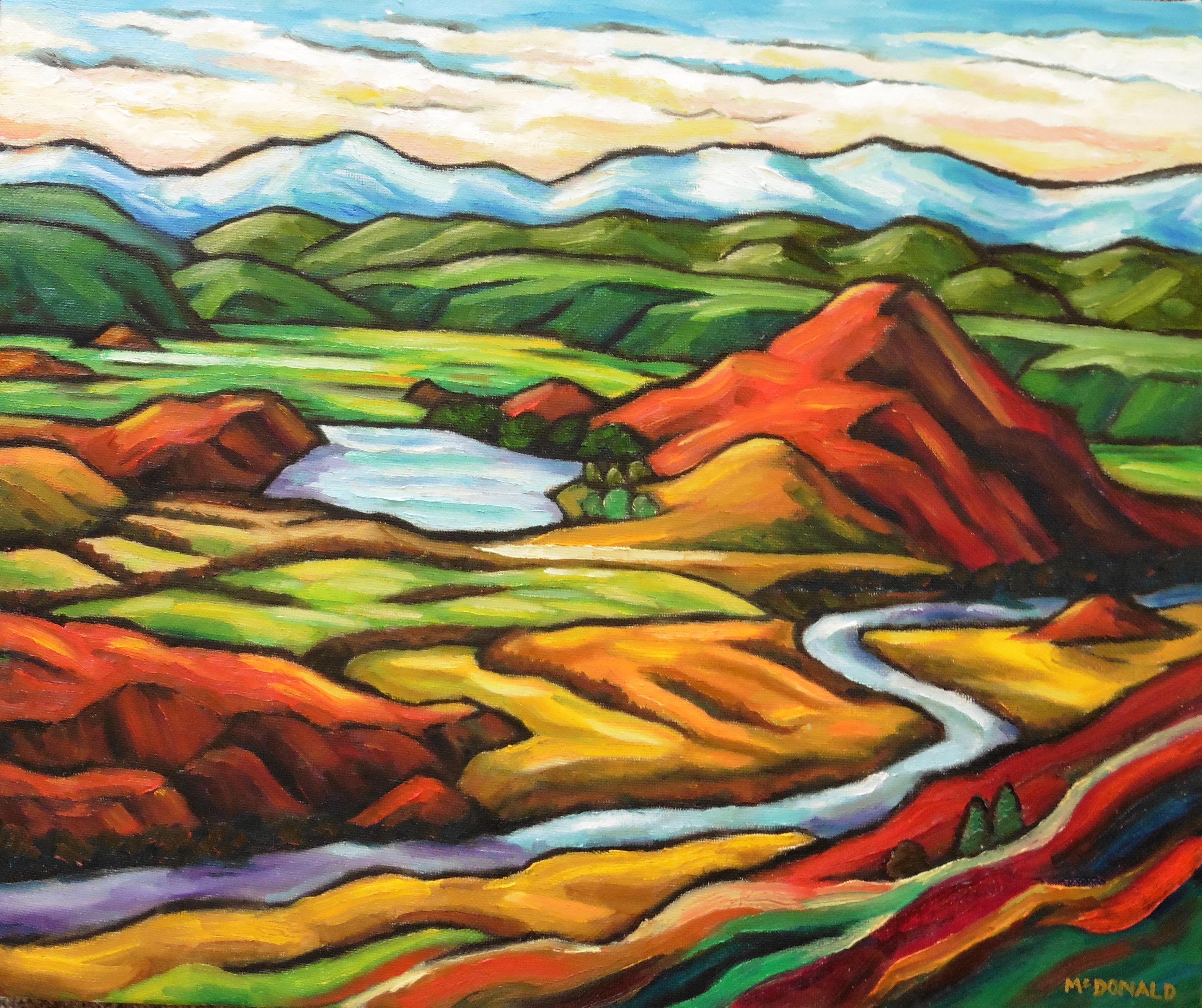 The last of the 3 started in Java. This view is from the hairpin road to the Remarkables Skifield looking west towards the Arrowtown area across about 10km of glacial morraine, very fore-shortened for this purpose. Oils 60cmx40cm