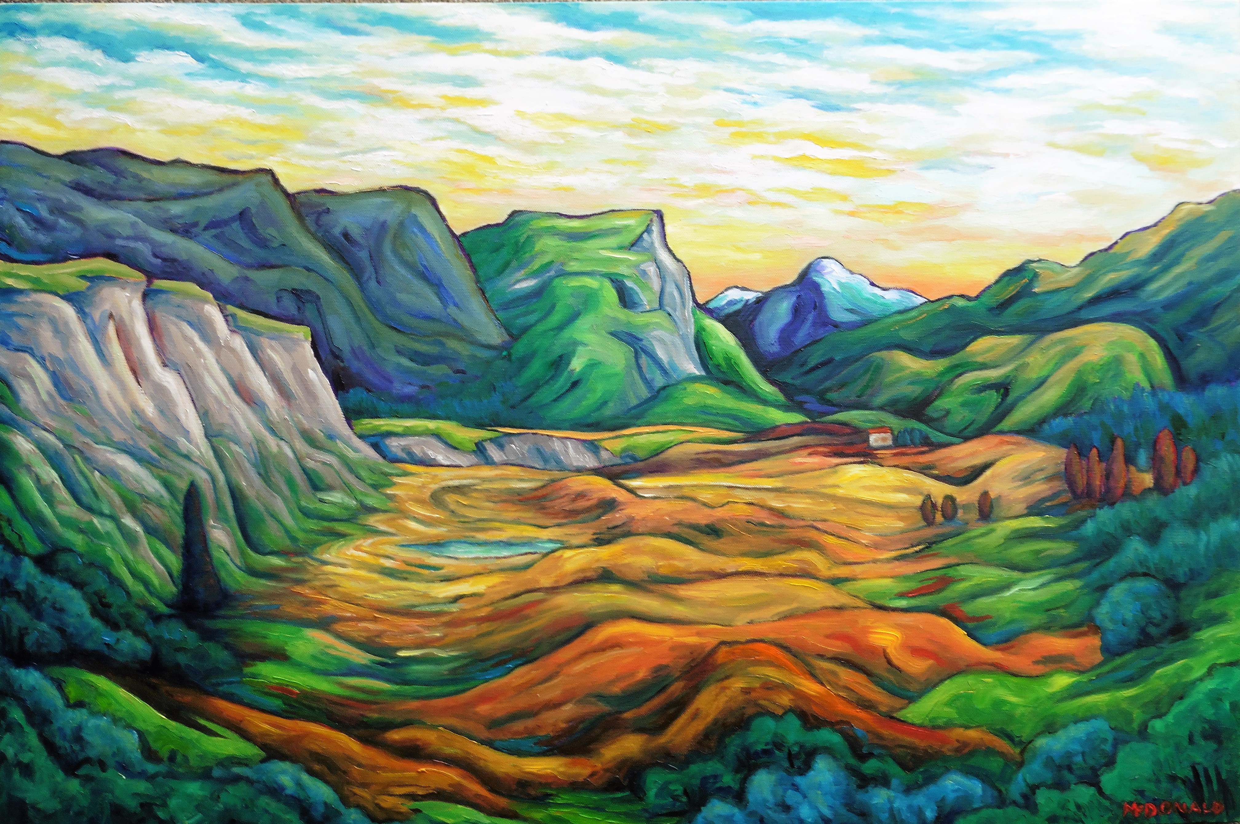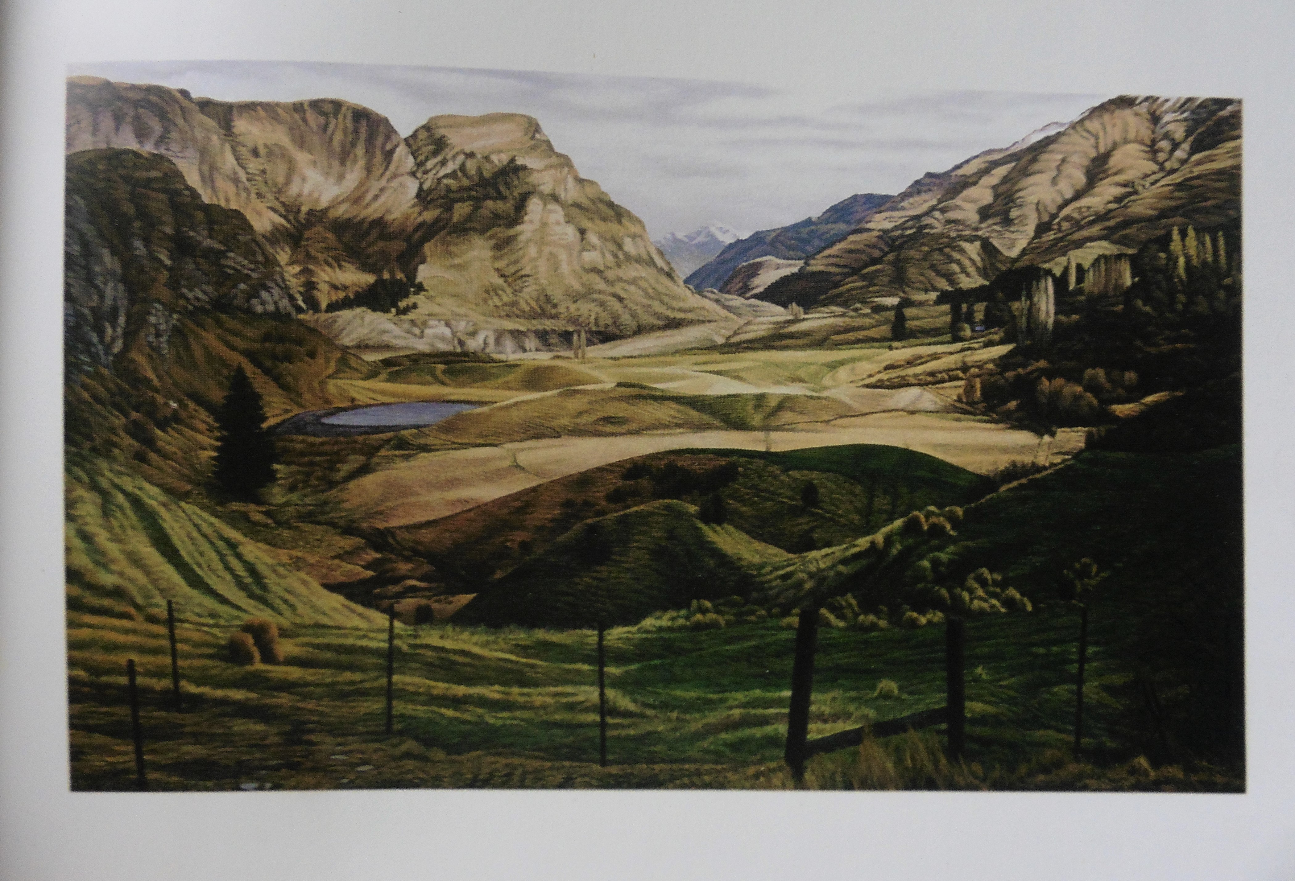 Second painting of this view, the turnoff to Coronet Peak skifields near Queenstown, New Zealand is on the mid-right. I’ve done 8 (?) paintings of the road crossing East-West in the middle of this valley, this is the full North-South glacial valley, U-shaped with moraine ridges on the floor, sides and end as bulldozed about by the unrelenting ice sheets. My earlier painting of this zoomed in on the younger V-shaped Shotover gorge at the end, as carved by the water outflow from the glacier – see gallery pic#1 (sold at Mana Arts Trail 2019). Dick Frizzell also painted this scene in 1999, “Small Valley” – per gallery pic#2.