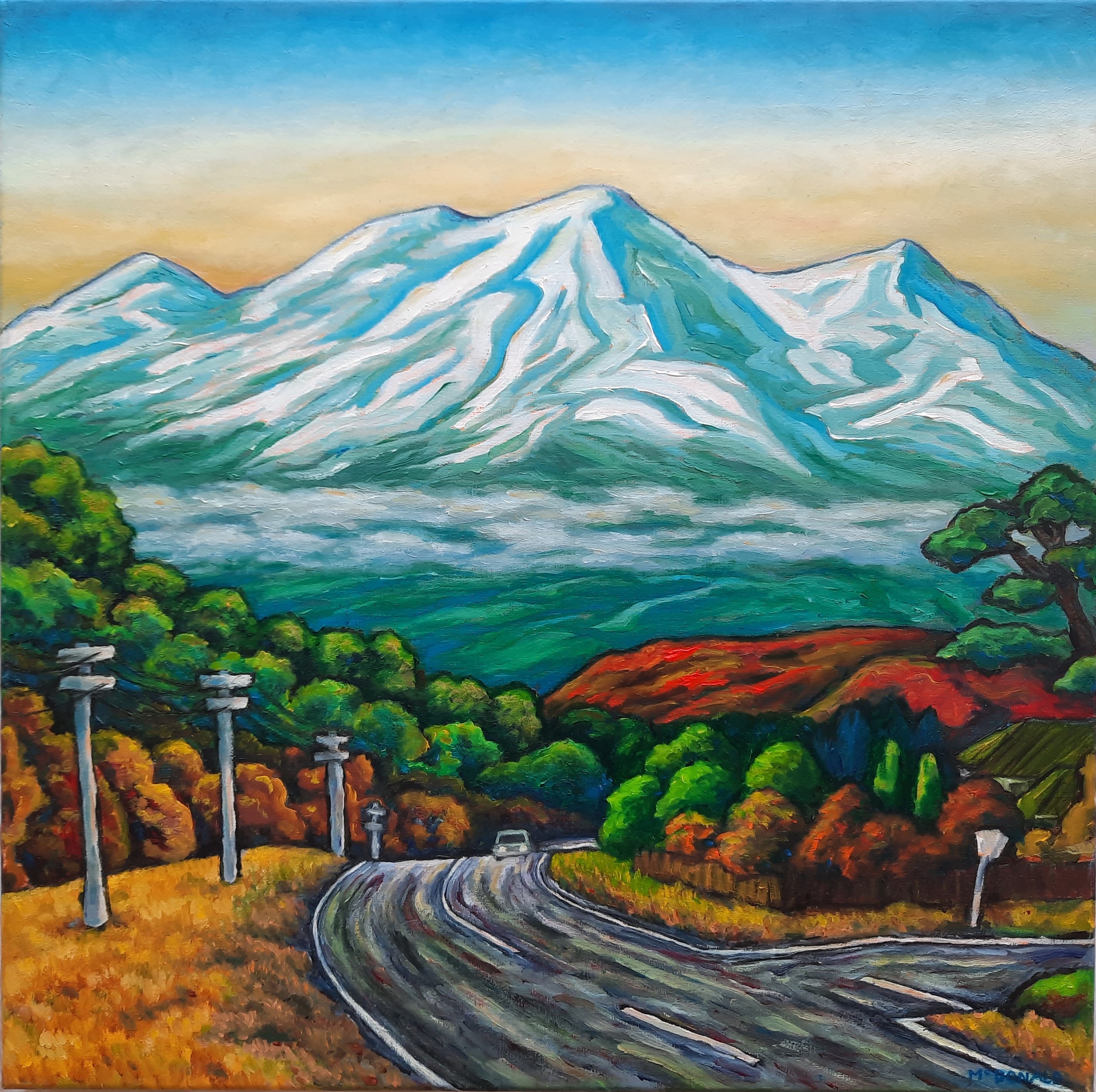 Ruapehu, active volcano with ski fields in the centre of the North Island, late afternoon on a bluebird day as it was today. Oils 500×500 on canvas