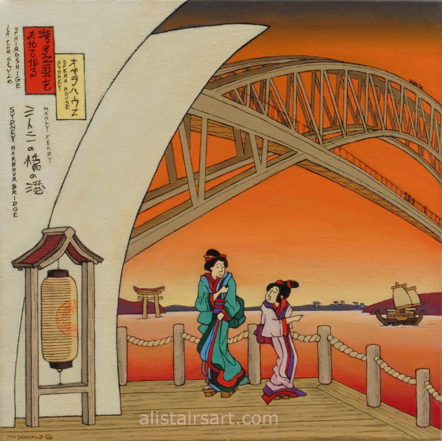 Click through on the 1st image to see a slideshow of 8 Sydney scenes (meisho-e = pictures of famous places). I have tried to imagine how Hiroshige (1797-1858) may have shown Sydney if he was alive today.