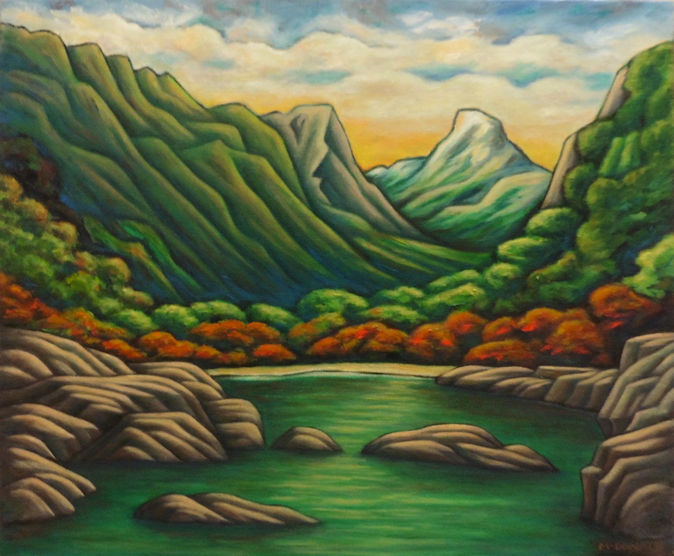 The Routeburn Track in Fiordland is one of New Zealand’s Great Walks. It’s 37km and 3 days worth, or 2 longish ones in my case with the weather closing in (of course some over-achievers run it in an afternoon). The range of scenery – mountains, waterfalls, beech and fern forests, epic glacial valleys and tarns, ending beside Lake Wakatipu in hobbit country – is a bit special. Oils on canvas 650mmx500mm