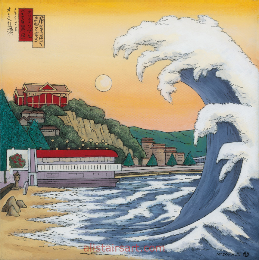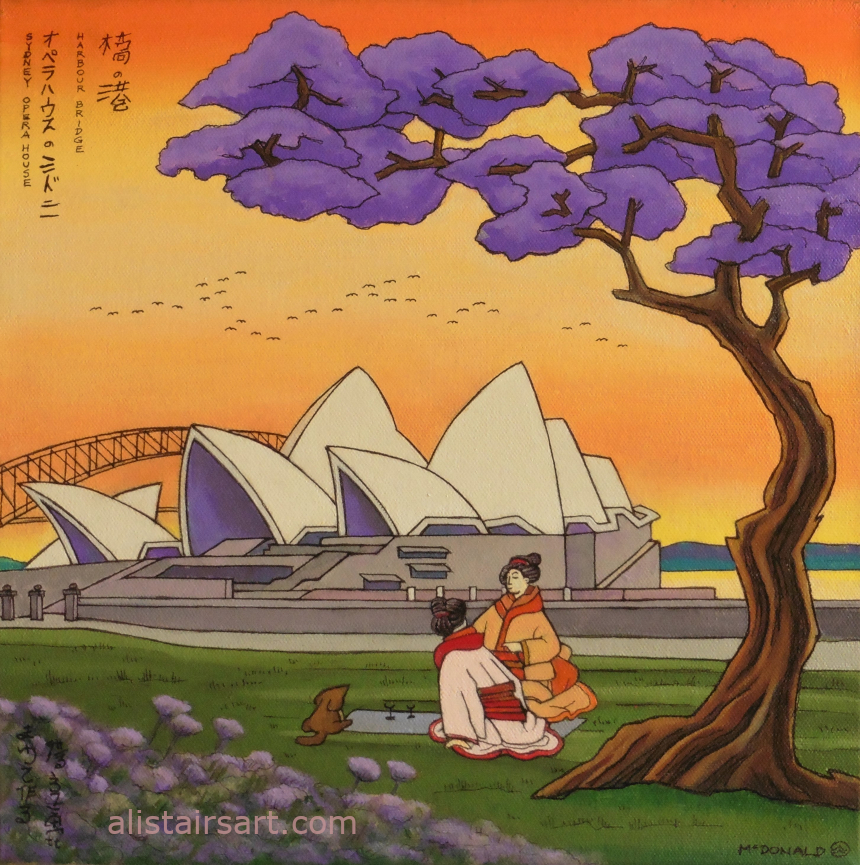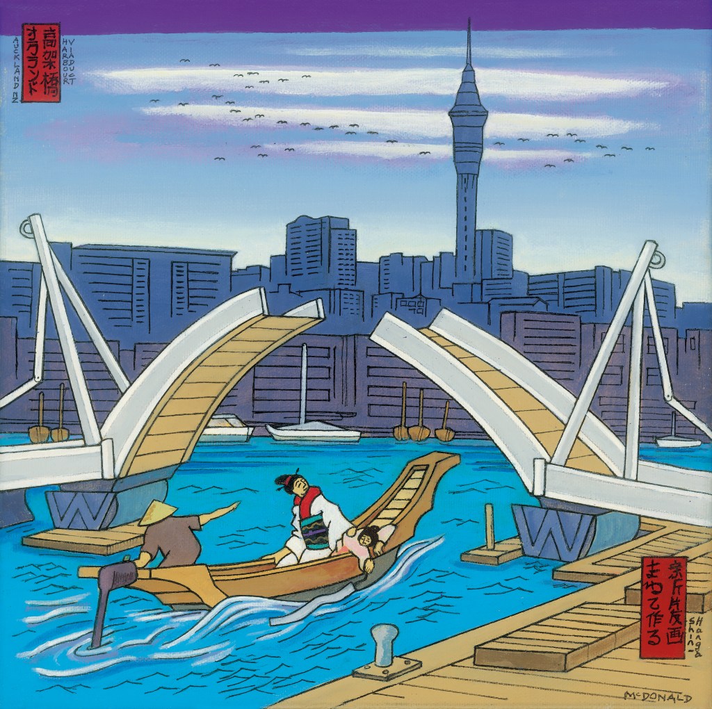 These are nikuhitsu-ga, paintings in an ukiyo-e style. I have tried to imagine how Hiroshige (1797-1858) and his contemporary Hokusai may have shown views of modern Wellington, Auckland, Queenstown, Wanaka, Mt Maunganui, Taranaki, Sydney and Melbourne if they were alive today.