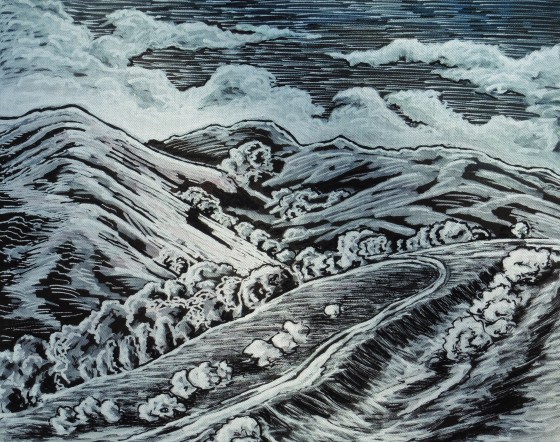 View from the foothills east of Arrowtown in the Queenstown valley. First time in this style, white acrylic pens on … More