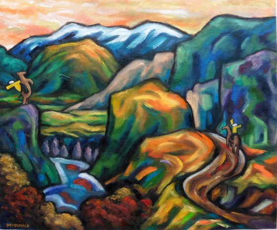 Epic view of the main hut on the Routeburn Track in Fiordland, one of NZ’s Great Walks. Oils 100x100cm